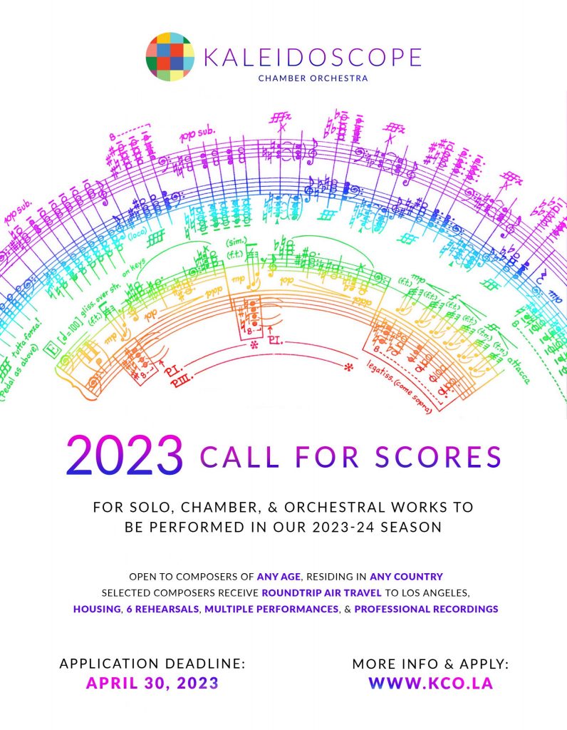 Our call for scores is open to solo, chamber, and orchestral works written in the past 10 years. Open to composers of any age, residing in any country. Selected composers receive round trip air travel to Los Angeles, housing, 6 rehearsals, multiple performances, and professional recordings. More info and apply at: www.kco.la
