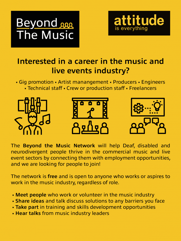 To find out more about the network and want to ask questions or offer opportunities to our network members, email beyondthemusic@attitudeiseverything.org.uk.