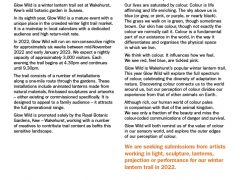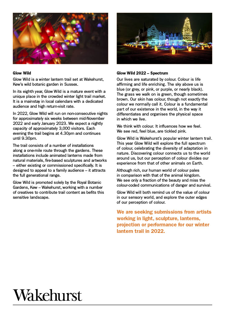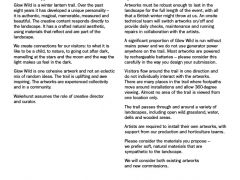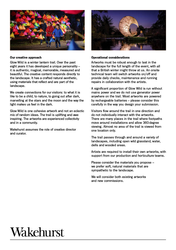 The team will then choose the artists they’d like to invite to visit Glow Wild 2021 and discuss the project with them in more detail. Following this a more detailed proposal will be submitted including some initial design ideas and costings.