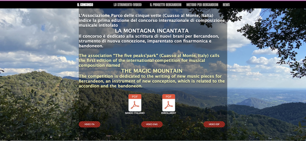 The association “The five peaks’park” (Cuasso al Monte, Italy) calls the first edition of the international competition (with free entry) for musical composition named THE MAGIC MOUNTAIN. The competition is dedicated to the writing of new songs for Bercandeon, an instrument of new conception, which is related to the accordion and the bandoneon.